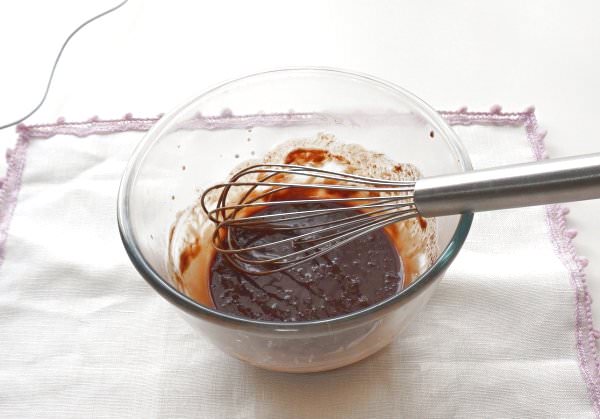 2. レンジで加熱する。30秒位加熱したら、取り出して泡だて器で混ぜる。チョコレートが解けていないようなら、もう少し加熱する。